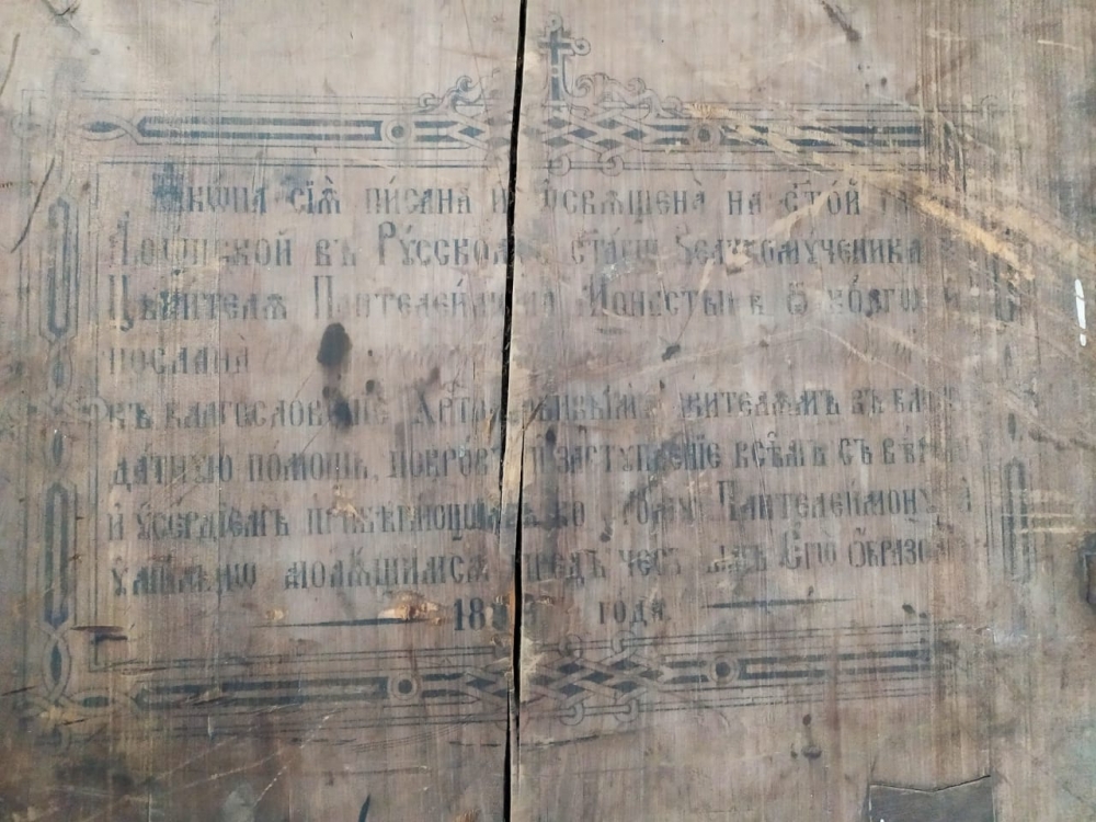 На обратной стороне иконы есть надпись : "Икона сия писана и освящена на святой горе Афонской в русском святого великомученика и целителя Пантелеимона монастыре от коего и послана в благословение христолюбивым жителям в благодатную помощь, покров и заступление всем с верою и усердием прибегающим ко святому Пантелеимону умильно молящимся пред честным его образом. 1899 года" (дата плохо читается).